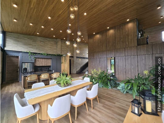Es una casa bastabte acogedora, con diseño moderno donde se integra la madera como elemento predominante, paredes en piedra natural, doble altura en la zona social, mucha iluminación y un entorno completamente verde maravilloso.
